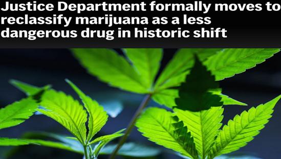 The Justice Department has issued a long-proposed new rule that formally recognizes the medical use of marijuana and concludes that it is less likely to be abused than many other drugs, recommending that marijuana be classified as a "less dangerous drug." If approved after a 60-day public comment period, the new rules would not fully legalize marijuana at the federal level, but would move it out of Schedule I of the Federal Controlled Substances Act, which lists the most dangerous drugs, like heroin, and into Schedule III, which lists less dangerous drugs, like ketamine and steroids.